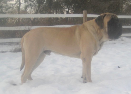 Quinn is a gentle dog with a friendly, mellow temperament. He has a huge head, great topline and excellent movement, and passes his best attributes on to his offspring.
